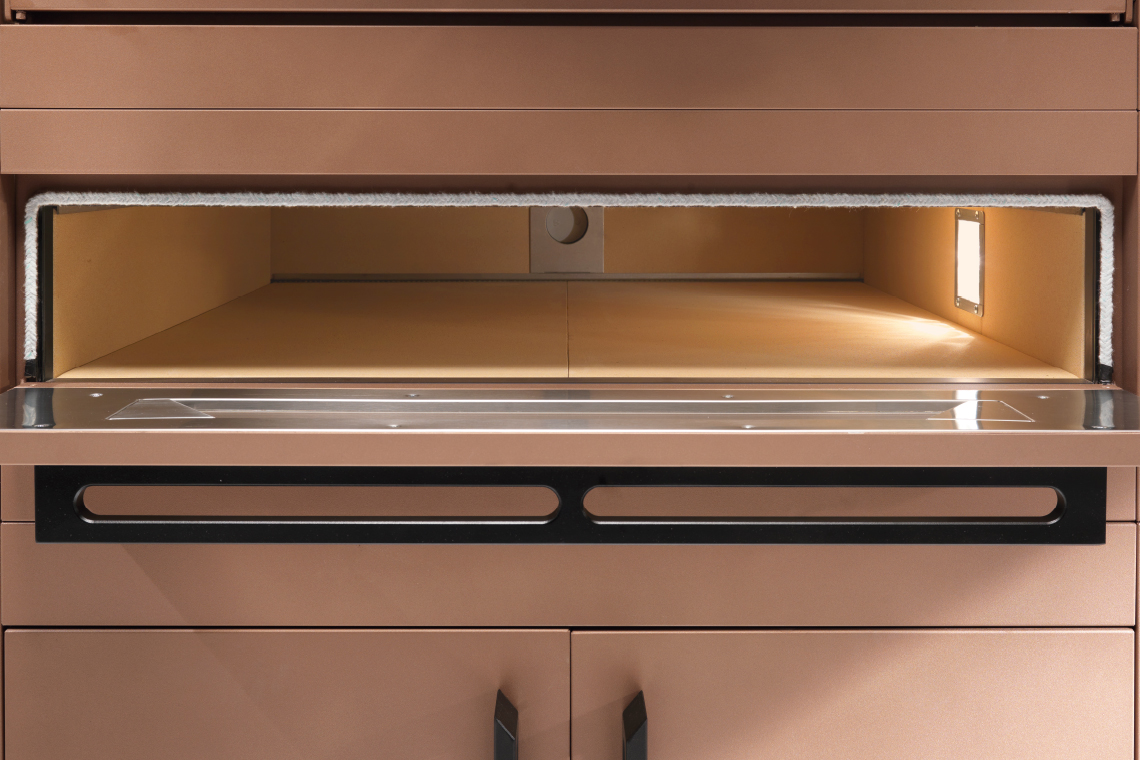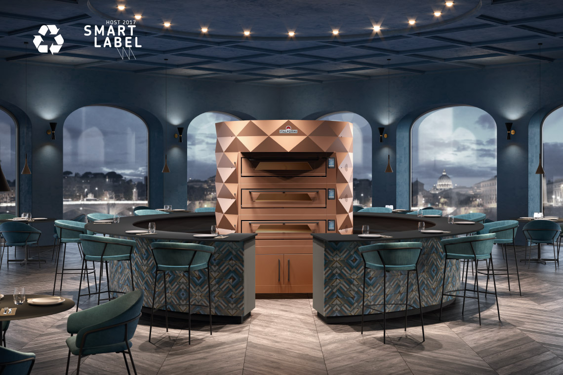 Modular electric deck oven with signature diamond-pattern facade and 360° panoramic design — installable in the center of the room. Single, double, or triple chamber up to 450°C with touch-screen control.