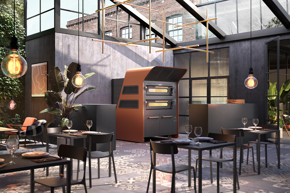 Modular electric deck oven with bold industrial design — ribbed steel exterior and premium finishes. Stackable chambers with independent controls, high-performance baking in any pizzeria or restaurant.
